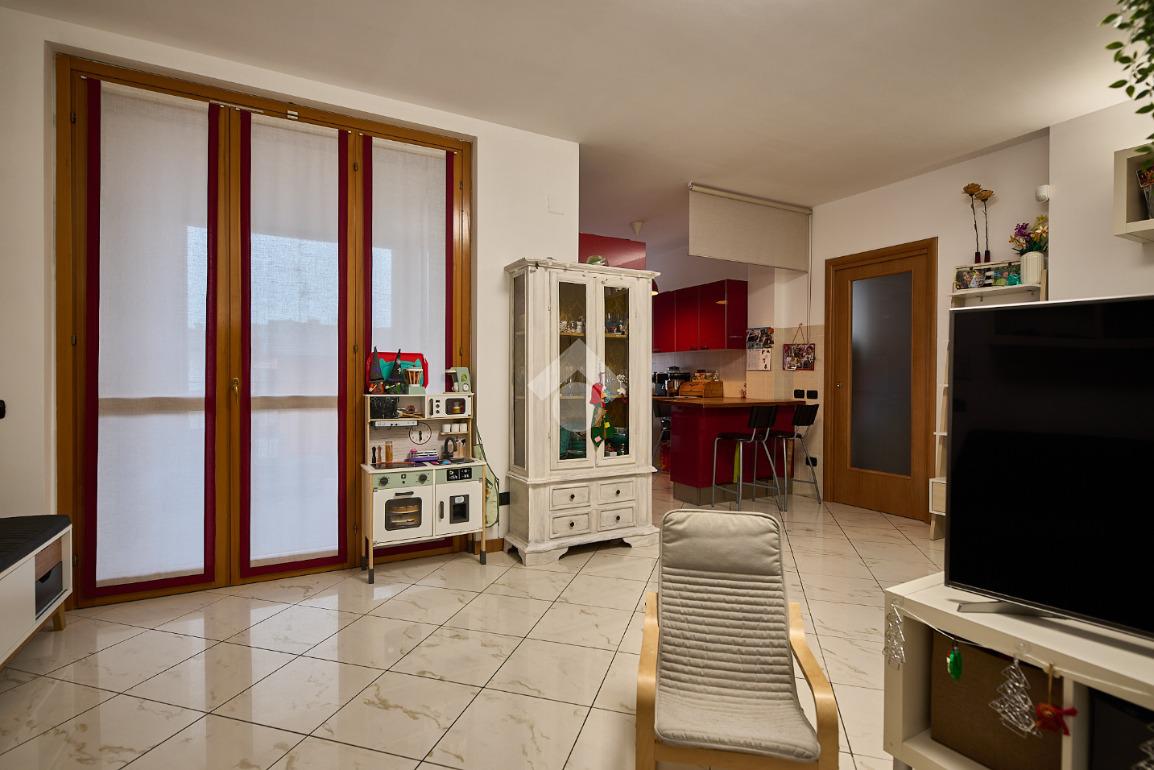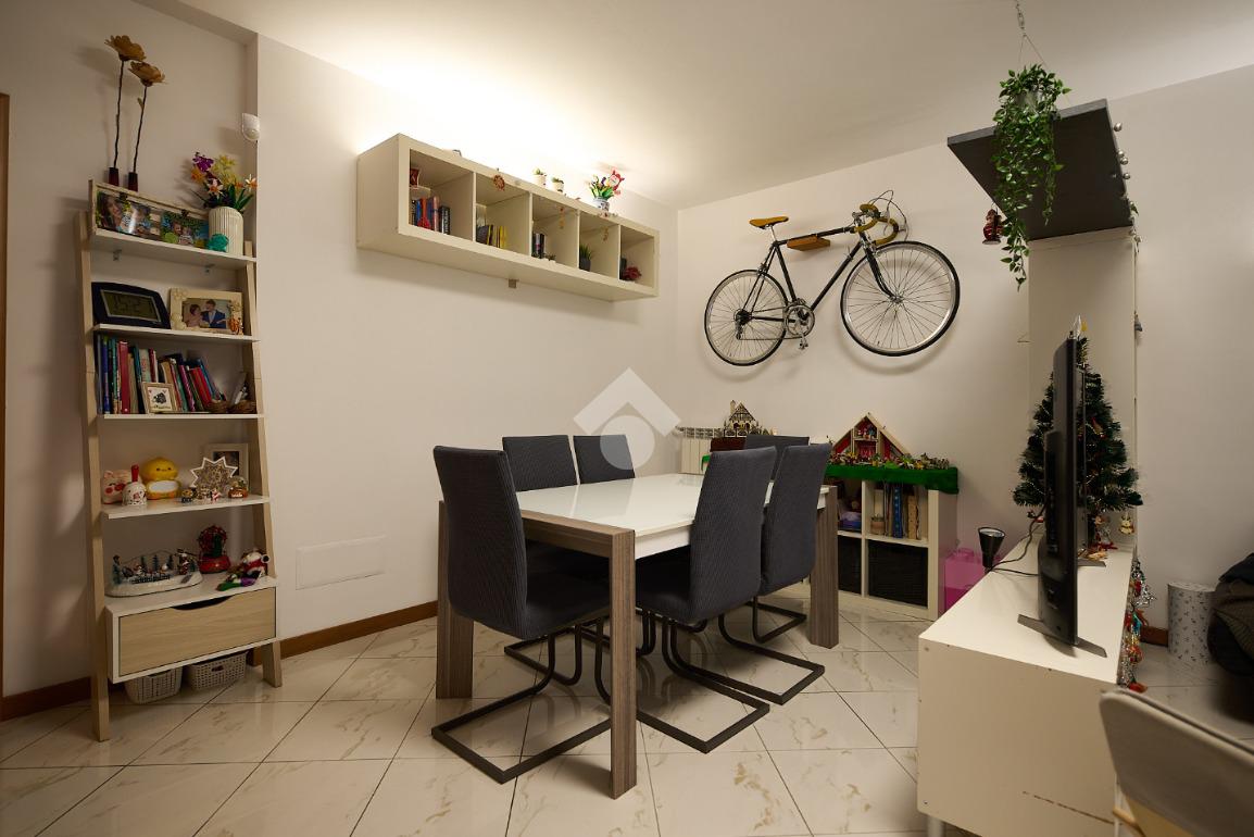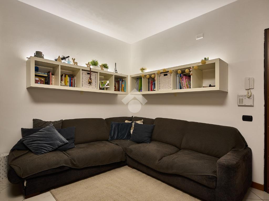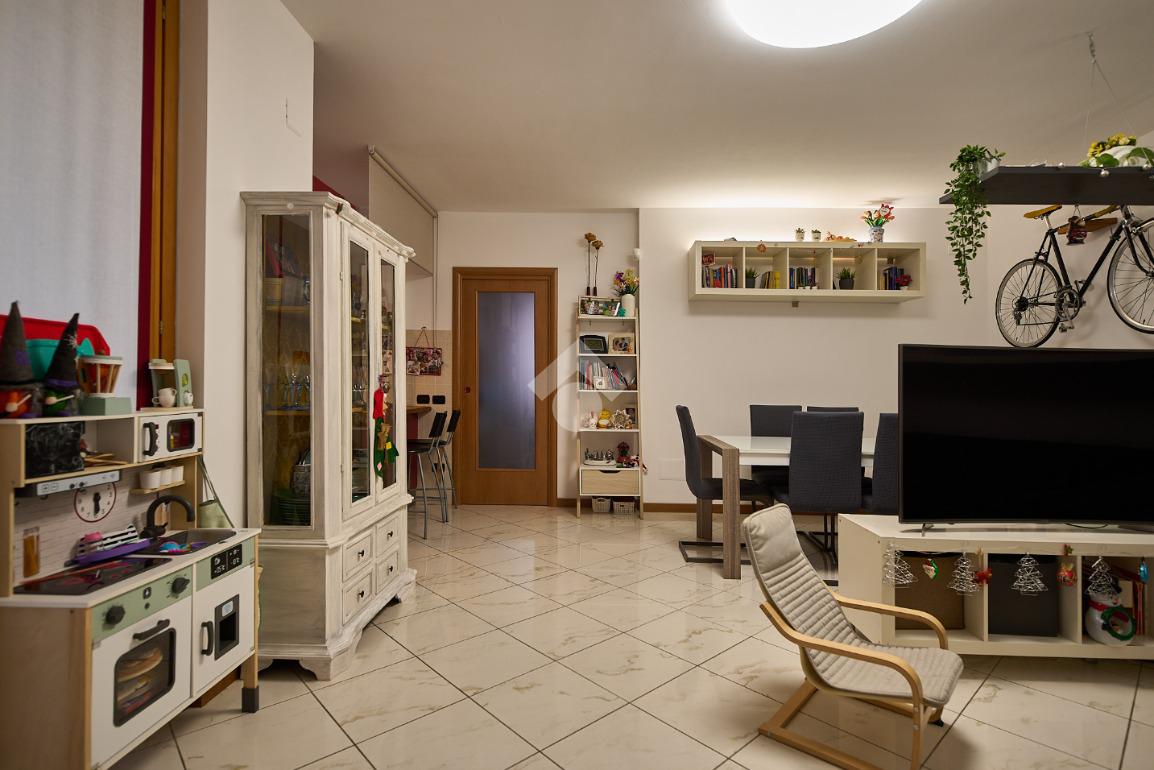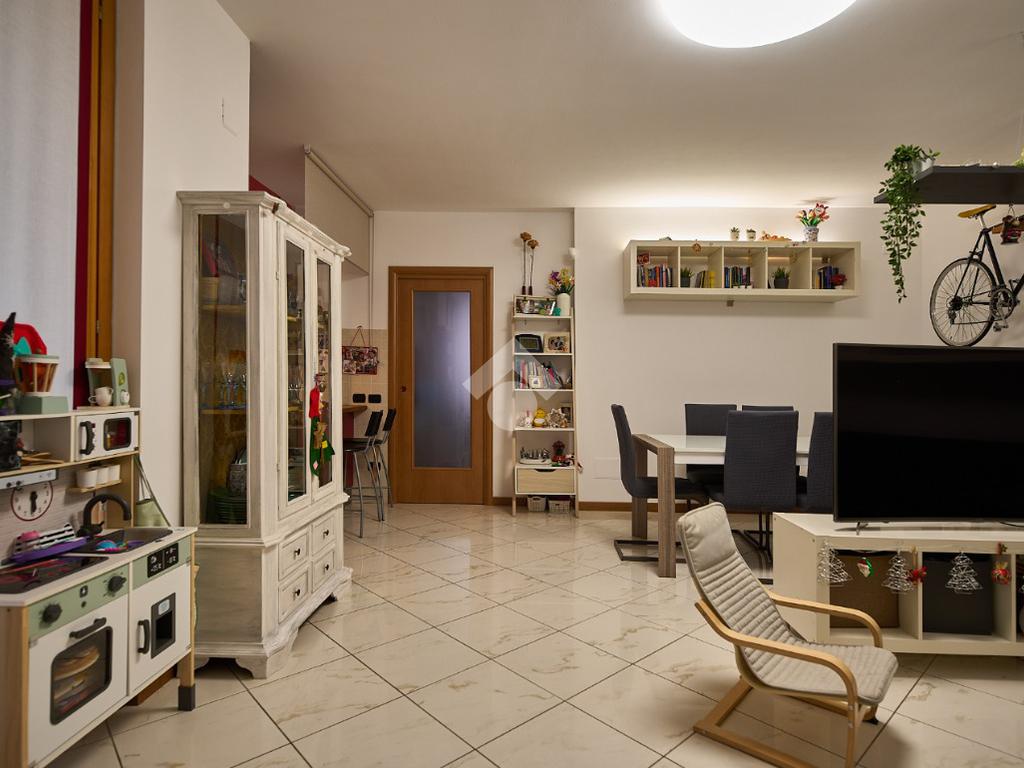 In una zona residenziale tranquilla ed abitata da famiglie. L'appartamento si trova al primo piano di una palazzina costruita nel 2009, è dotato di predisposizione per l'impianto di aria condizionata, serramenti con doppi vetri e persiane in alluminio, impianto di allarme e filodiffusione. L'ingresso è nella zona living con cucina annessa. La zona living è ampia e luminosa , divisa in due aree, una con divano angolare e TV e l'altra con il tavolo da pranzo, ad illuminare tutto è la portafinestra che dà l'accesso al terrazzino loggiato e con zanzariere. La cucina è abitabile per dimensioni e si potrebbe anche dividere dal soggiorno, attualmente è stata montata una penisola che affaccia sulla sala e divide i due ambienti. Dalla zona living si accede al disimpegno che accompagna alle camere ed al bagno. Le camere sono due, una singola ed una matrimoniale con portafinestra e finestra. Il bagno ha la finestra e la doccia. Completano la proprietà la cantina ed il box auto.