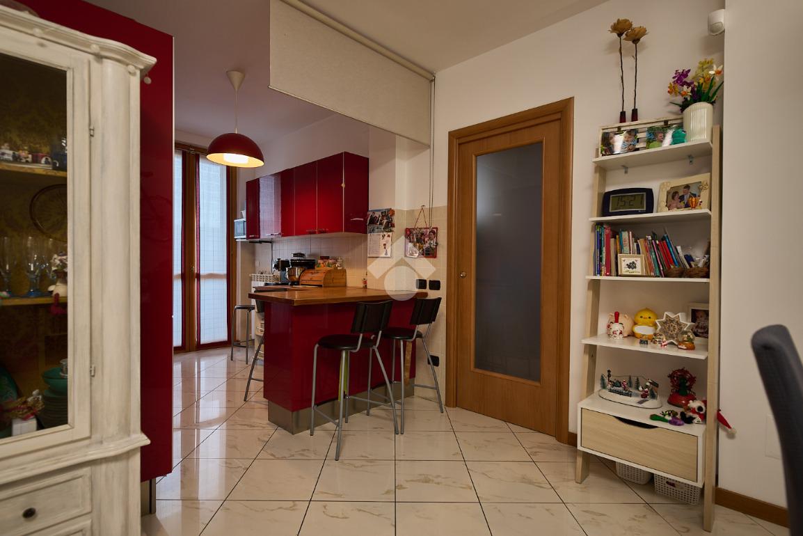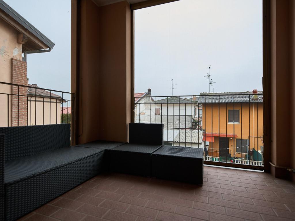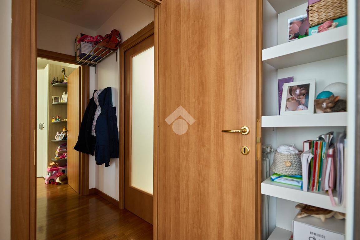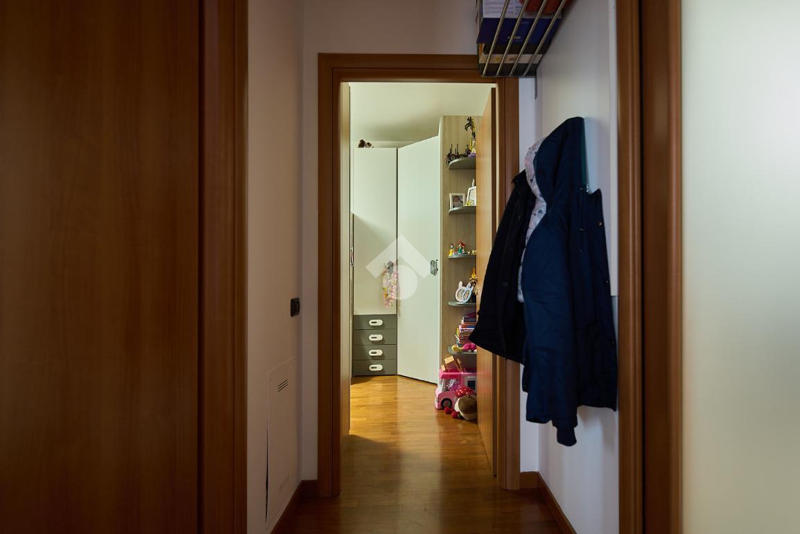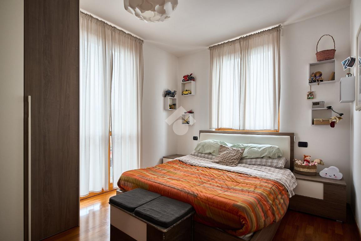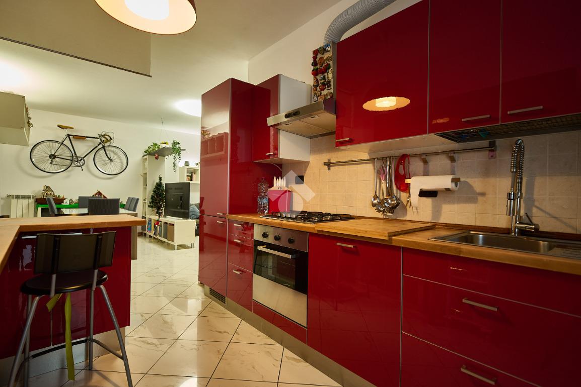 In una zona residenziale tranquilla ed abitata da famiglie. L'appartamento si trova al primo piano di una palazzina costruita nel 2009, è dotato di predisposizione per l'impianto di aria condizionata, serramenti con doppi vetri e persiane in alluminio, impianto di allarme e filodiffusione. L'ingresso è nella zona living con cucina annessa. La zona living è ampia e luminosa , divisa in due aree, una con divano angolare e TV e l'altra con il tavolo da pranzo, ad illuminare tutto è la portafinestra che dà l'accesso al terrazzino loggiato e con zanzariere. La cucina è abitabile per dimensioni e si potrebbe anche dividere dal soggiorno, attualmente è stata montata una penisola che affaccia sulla sala e divide i due ambienti. Dalla zona living si accede al disimpegno che accompagna alle camere ed al bagno. Le camere sono due, una singola ed una matrimoniale con portafinestra e finestra. Il bagno ha la finestra e la doccia. Completano la proprietà la cantina ed il box auto.