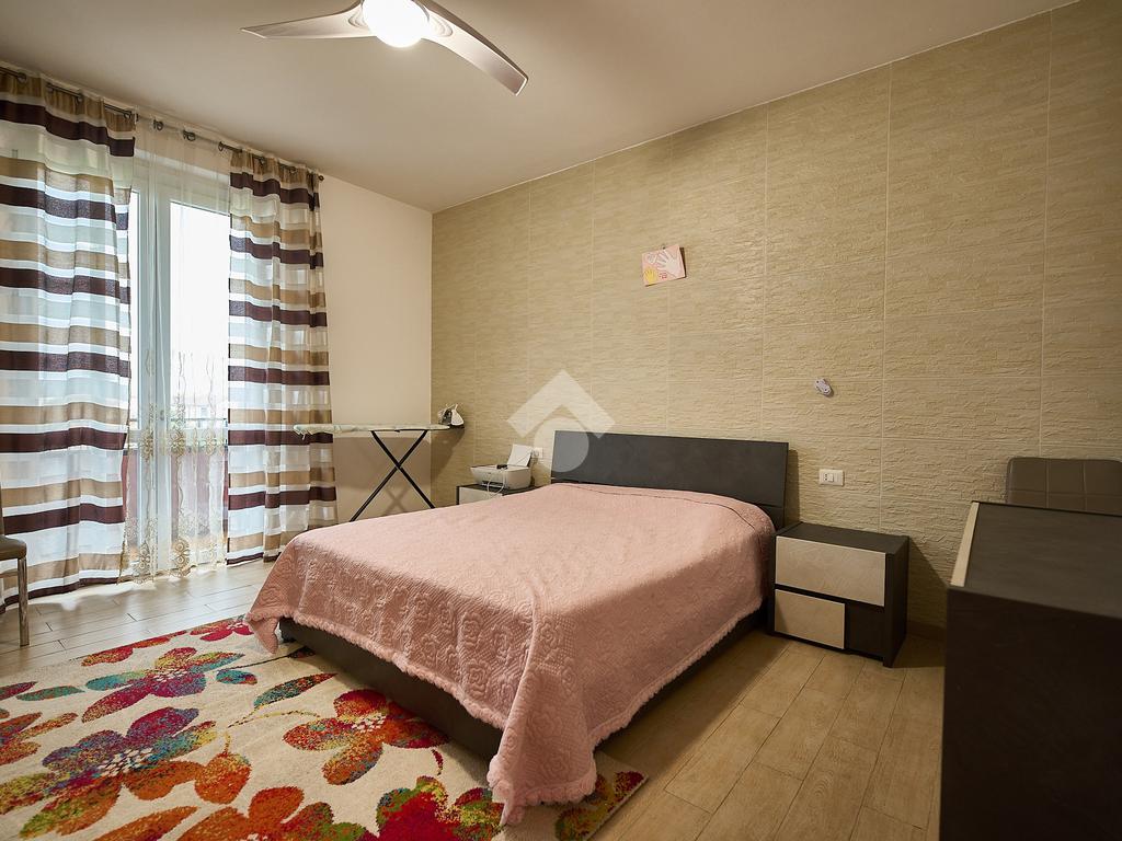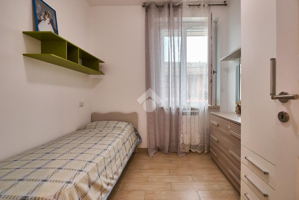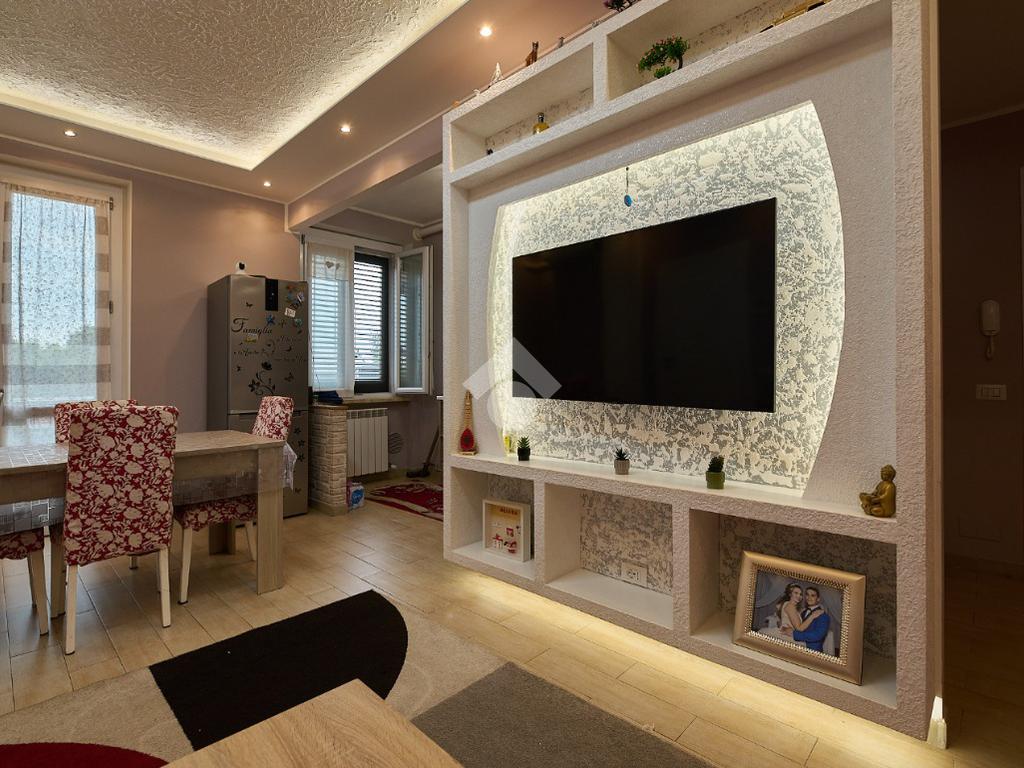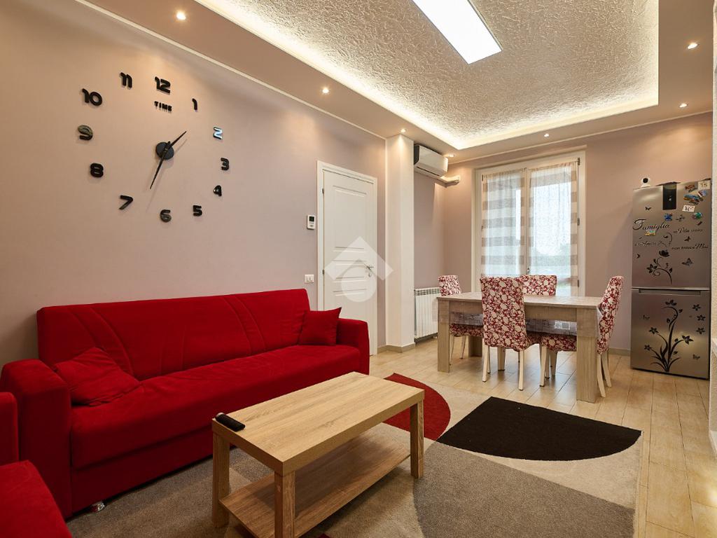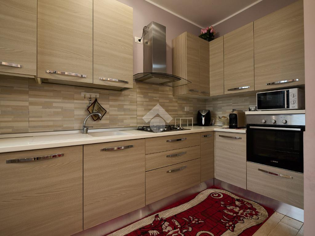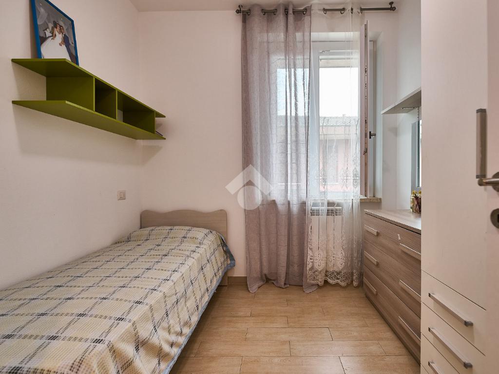 Nel centro del paese, sopra i portici e vicino al polo scolastico, tutti i servizi sono raggiungibili a piedi in un paio di minuti. La palazzina è stata costruita negli anni '80 ed ha basse spese di condominio. L'appartamento, situato al secondo ed ultimo piano, è stato ristrutturato nel 2017 ed ha il riscaldamento autonomo, l'impianto di aria condizionata e la caldaia a condensazione. Durante i lavori di ristrutturazione sono stati cambiati i serramenti, le porte interne, i rivestimenti di bagno e cucina e la pavimentazione di tutto l'appartamento, inoltre nel disimpegno della zona notte è stato montato un controsoffitto ed è stato ricavato un ampio spazio ad uso ripostiglio. L'ingresso è nel disimpegno, attrezzato per riporre scarpe e cappotti, che accompagna alla zona giorno con annesso cucinotto. Un locale ampio e luminoso in cui è stato creato un gioco di luci. Dalla zona giorno si accede al disimpegno della zona notte che accompagna alle camere ed al bagno. Il bagno è finestrato ed ha la doccia, c'è anche lo spazio per lavatrice e asciugatrice. Le camere da letto sono tre, due matrimoniali ed una singola. Completa la proprietà il box auto.