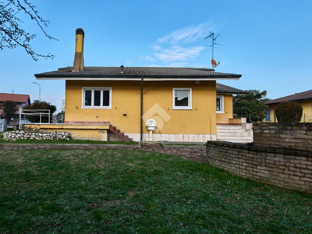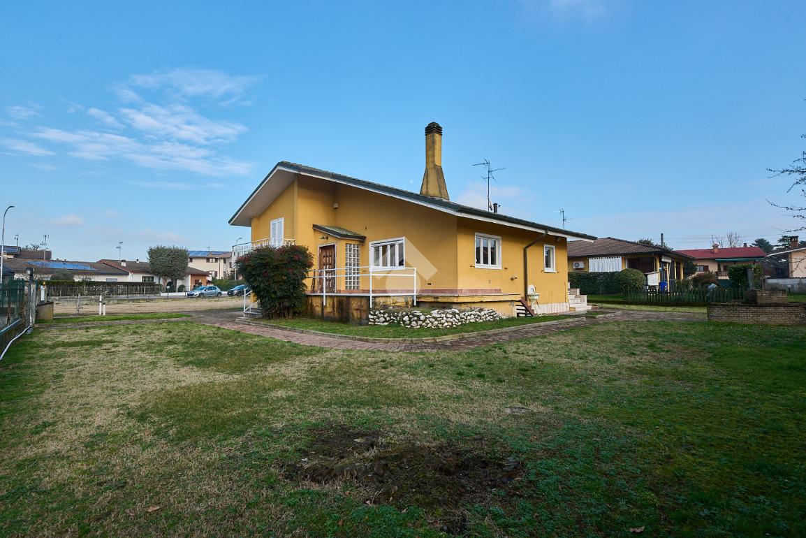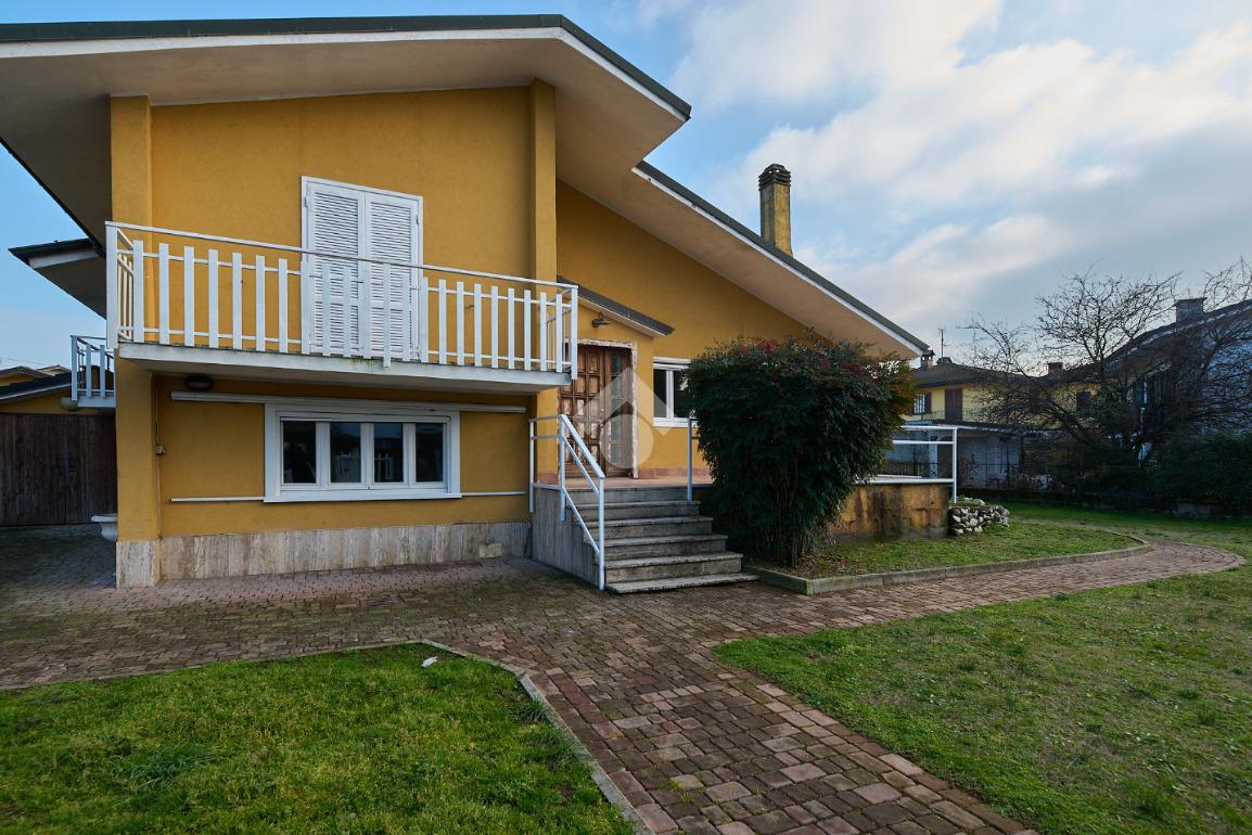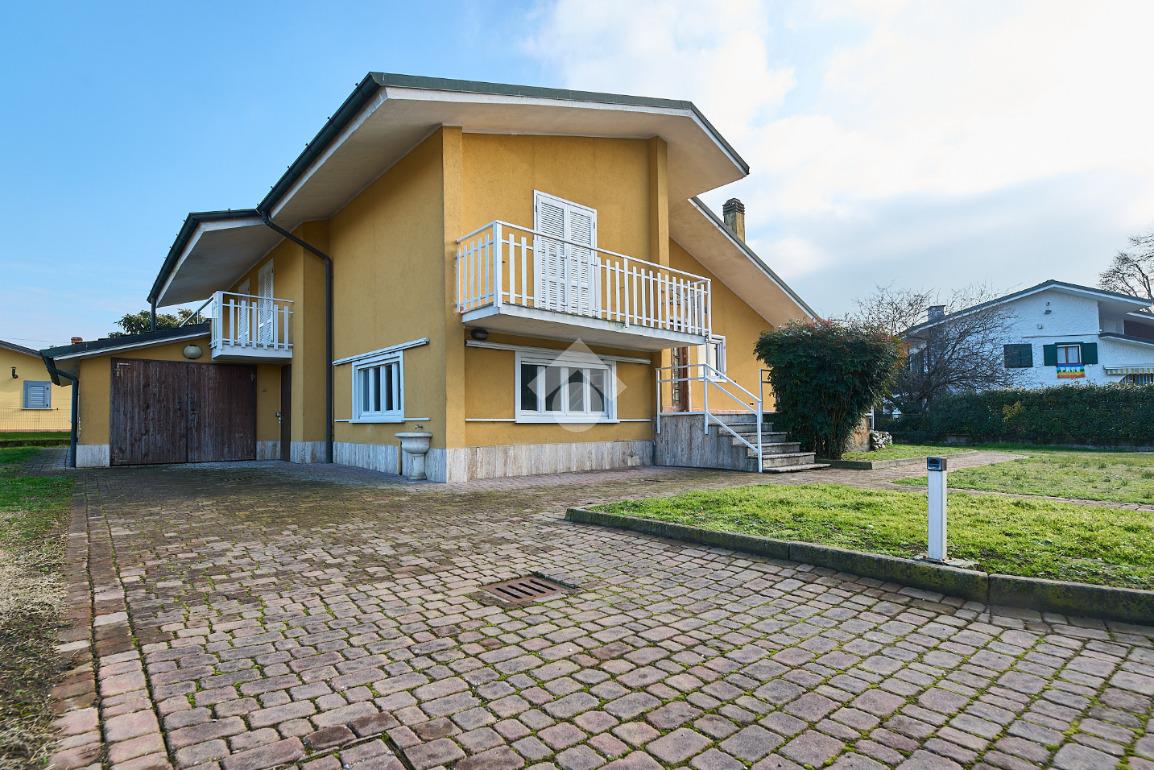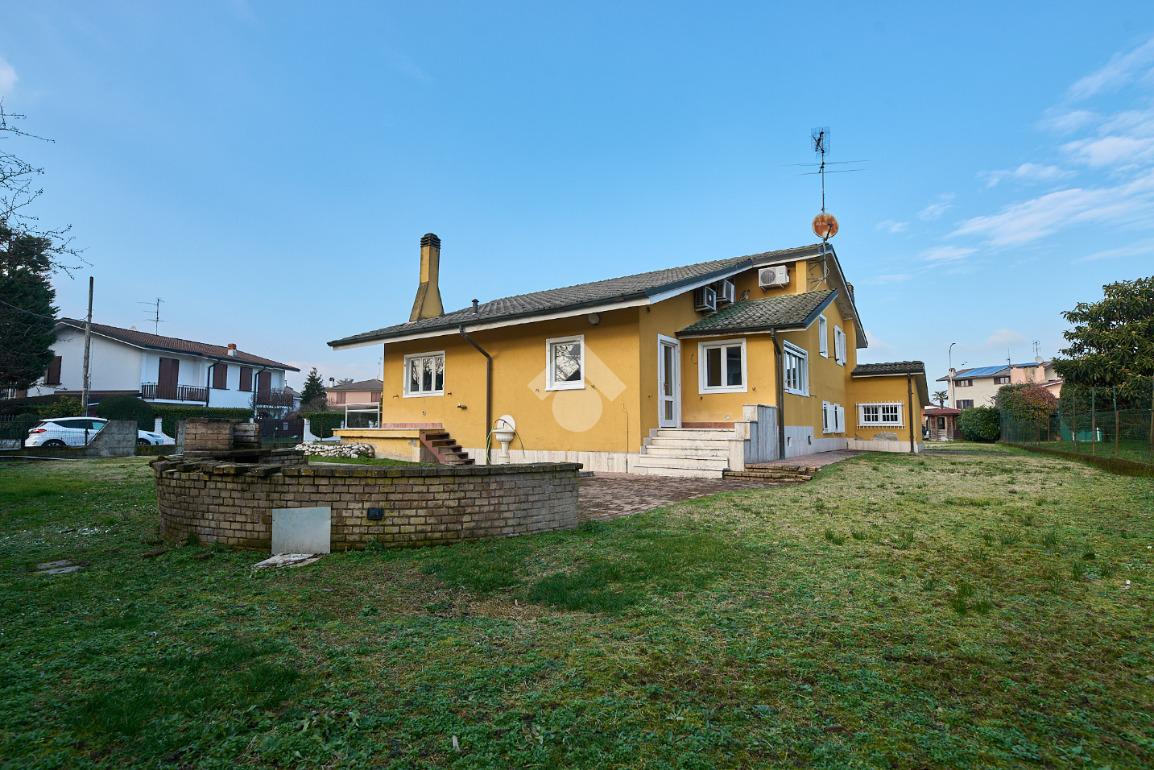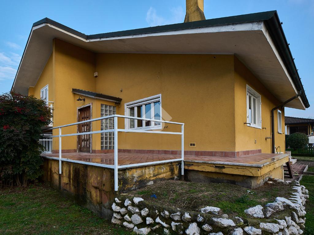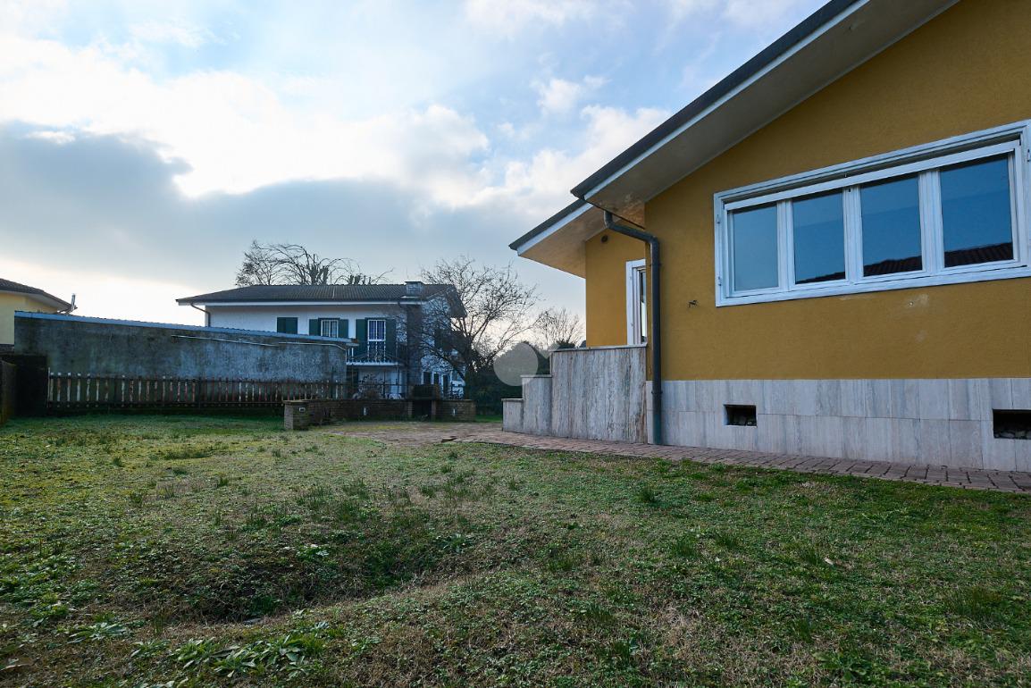 Al 'Villaggio Europa', circondata dal giardino privato di 450 mq, questa villa costruita negli anni '70 e libera subito è appena stata imbiancata e risistemata. Dotata di serramenti in legno e parquet in tutte le stanze, è elegante e luminosa, al suo interno la zona giorno e la zona notte sono separate da un dislivello di qualche gradino, un gioco di altezze che cra movimento mantendendo praticità e riservatezza. Dal piano strada un vialetto accompagna ai gradini davanti al portoncino d'ingresso, dove si trova il terrazzo di 20 mq. L'ingresso è nella sala da pranzo con stufa a pellet, dalla sala si accede alla cucina abitabile, alla zona notte e al piano seminterrato in cui ci sono la tevernetta con bagno/lavanderia ed il box auto. Nella zona notte ci sono tre camere da letto , un bagno e un sottotetto che può essere utilizzato come studio o locale-hobby. Sicuramente il punto di forza di questa soluzione è l'ampio giardino esposto a sud, con la possibilità di mettere una piscina interrata.