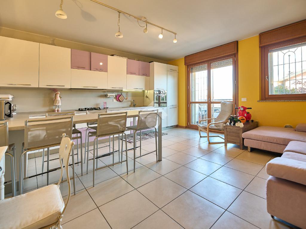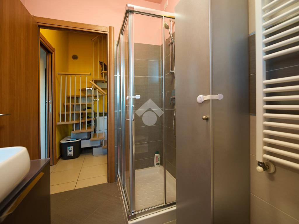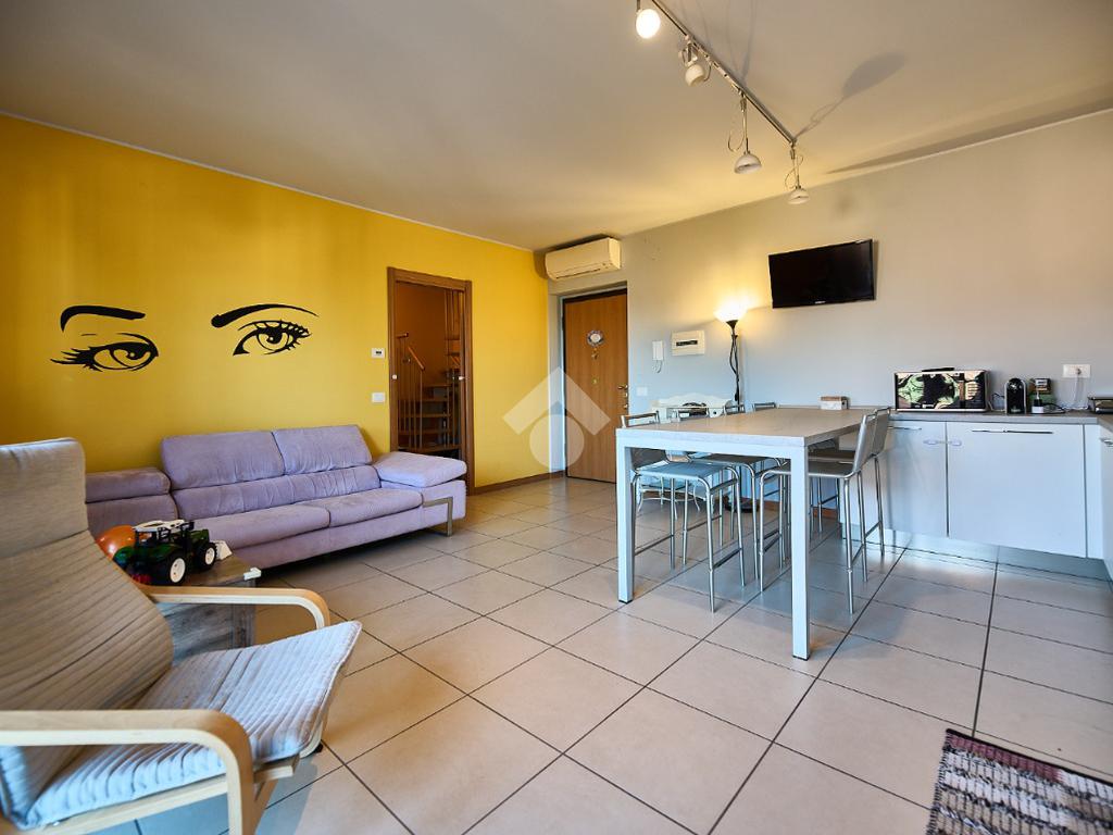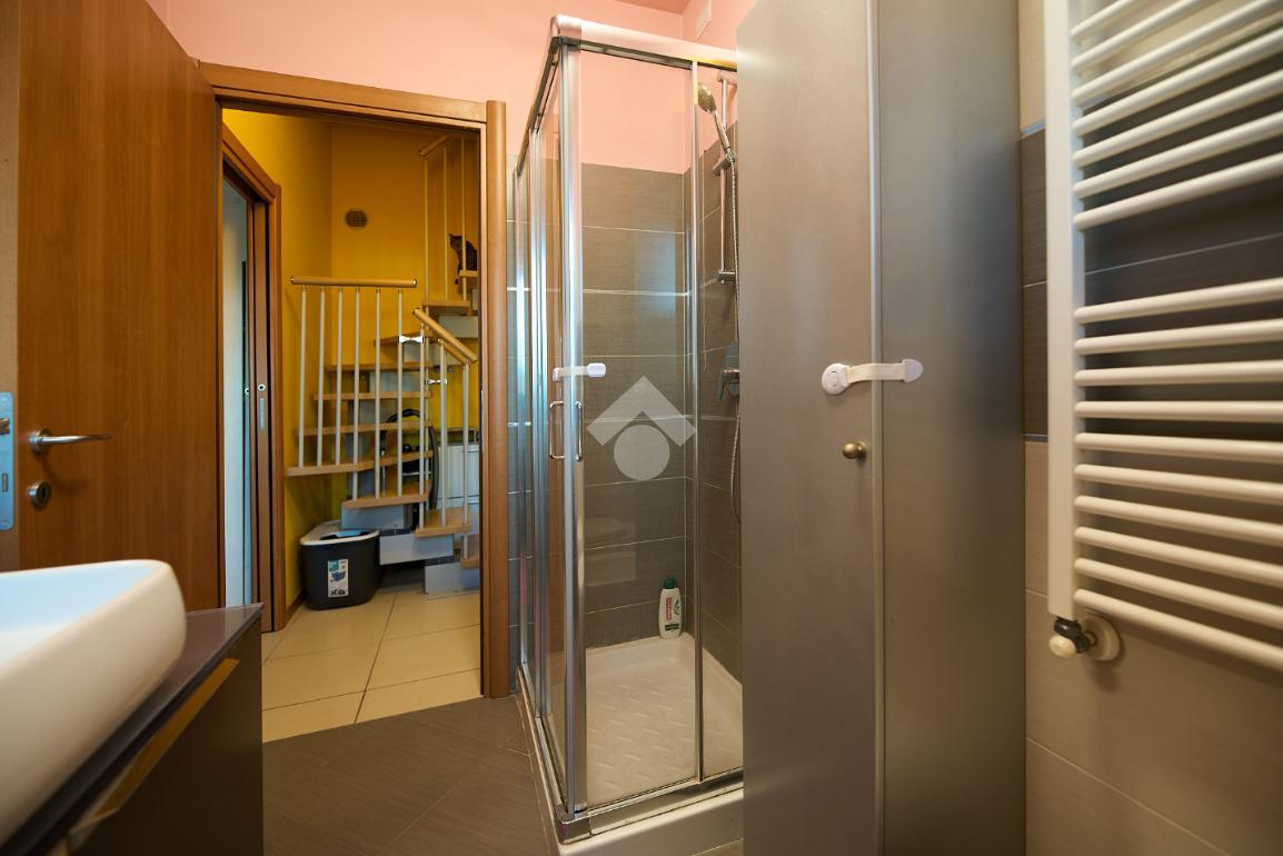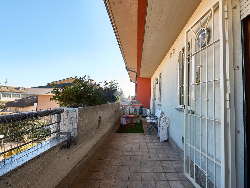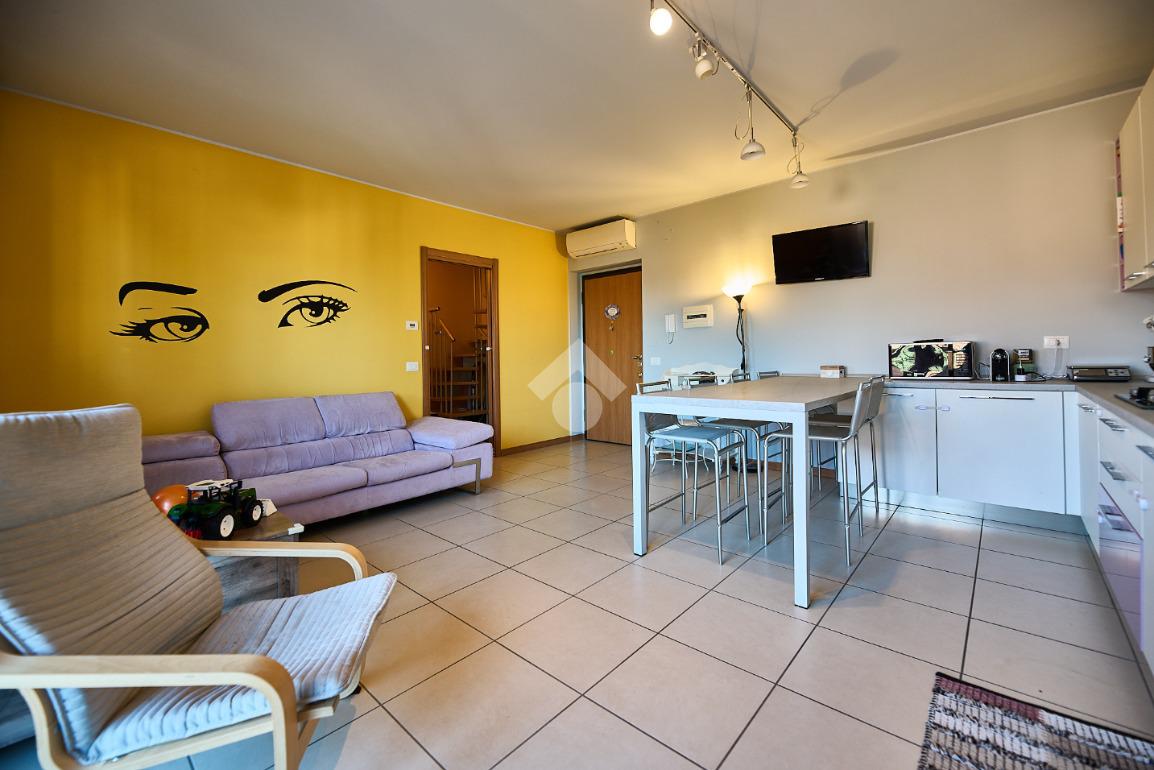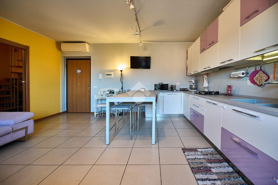 In Via Dante, a pochi poassi dal supermercato e dalla fermata dell'autobus, il polo scolastico e la piazza centrale sono raggiungibili a piedi. L'appartamento è distribuito su due livelli e si trova al primo piano di una palazzina costruita nel 2013 e dotata di ascensore, realizzata nel rispetto delle normative sul risparmio energetico, quindi attrezzata di cappotto termico, ventilazione meccanica, impianto solare termico e riscaldamento a pavimento. L'ingresso è nella zona living con cucina a vista e portafinestra che dà accesso al terrazzo di 20 mq. Dalla zona living si accede al disimpegno che accompagna al bagno, alla camera e alla scala che porta al piano superiore. Il bagno ha la doccia e la finestra, la camera da letto è matrimoniale e grande abbastanza da ospitare anche un lettino qualora ce ne fosse bisogno. Al piano superiore è presente una cameretta con un piccolo balcone e una lavanderia con la doccia. Questa soluzione è l'ideale per chi necessita di uno spazio per lo smart working o per chi ha bisogno di una seconda camera per gli ospiti o i figli grandi. L'appartamento è in ottimo stato, ben tenuto e all'interno di un complesso signorile. Completano la proprietà la cantina ed il box auto.