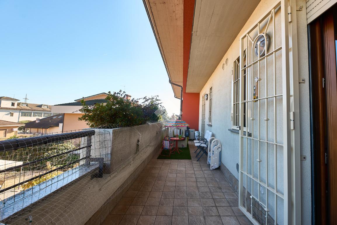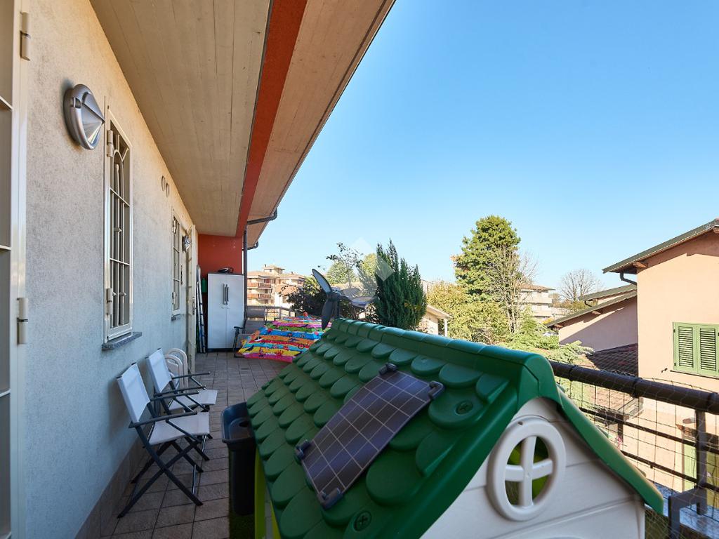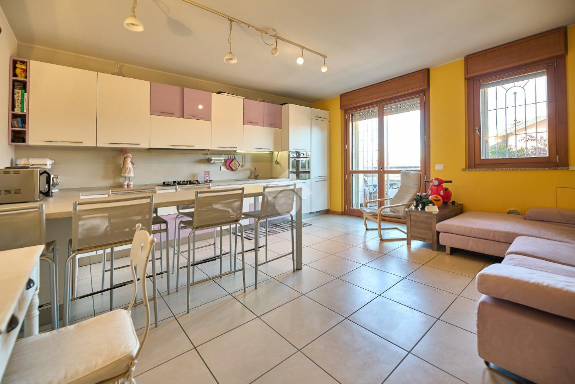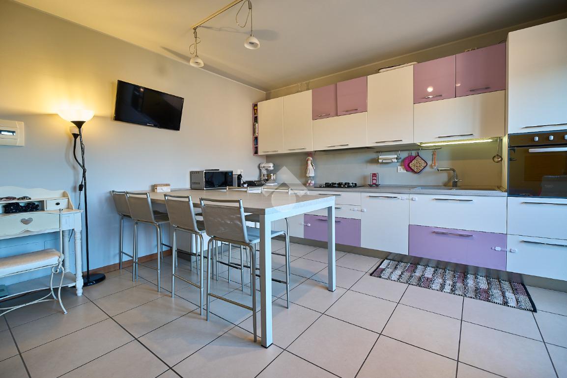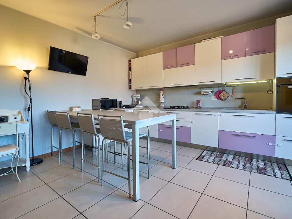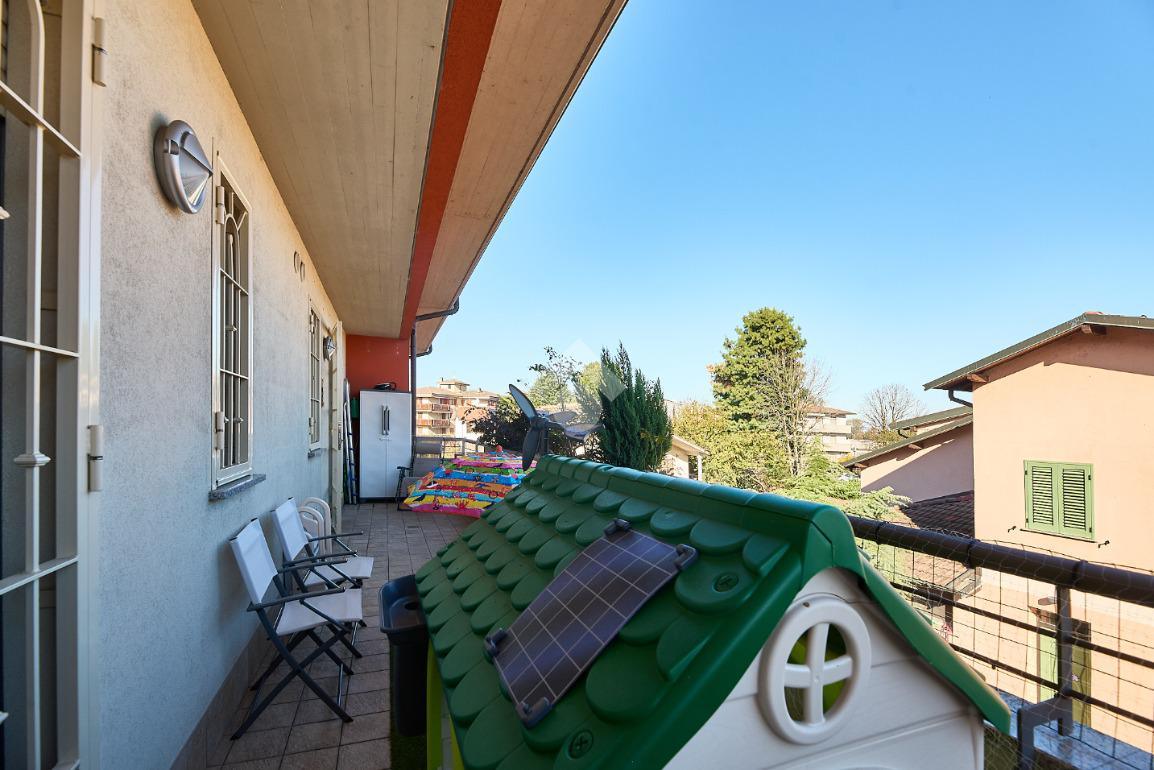 In Via Dante, a pochi poassi dal supermercato e dalla fermata dell'autobus, il polo scolastico e la piazza centrale sono raggiungibili a piedi. L'appartamento è distribuito su due livelli e si trova al primo piano di una palazzina costruita nel 2013 e dotata di ascensore, realizzata nel rispetto delle normative sul risparmio energetico, quindi attrezzata di cappotto termico, ventilazione meccanica, impianto solare termico e riscaldamento a pavimento. L'ingresso è nella zona living con cucina a vista e portafinestra che dà accesso al terrazzo di 20 mq. Dalla zona living si accede al disimpegno che accompagna al bagno, alla camera e alla scala che porta al piano superiore. Il bagno ha la doccia e la finestra, la camera da letto è matrimoniale e grande abbastanza da ospitare anche un lettino qualora ce ne fosse bisogno. Al piano superiore è presente una cameretta con un piccolo balcone e una lavanderia con la doccia. Questa soluzione è l'ideale per chi necessita di uno spazio per lo smart working o per chi ha bisogno di una seconda camera per gli ospiti o i figli grandi. L'appartamento è in ottimo stato, ben tenuto e all'interno di un complesso signorile. Completano la proprietà la cantina ed il box auto.