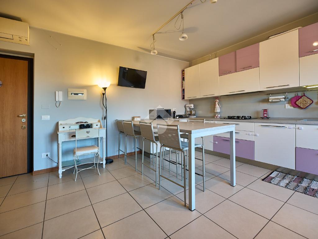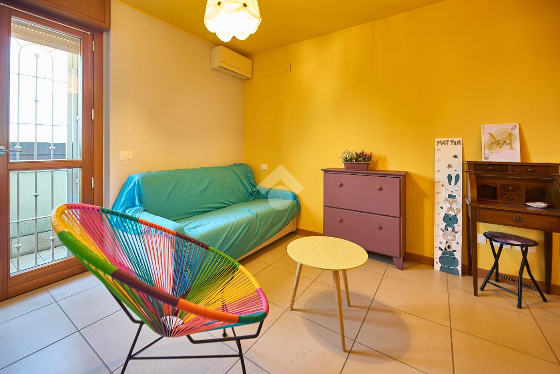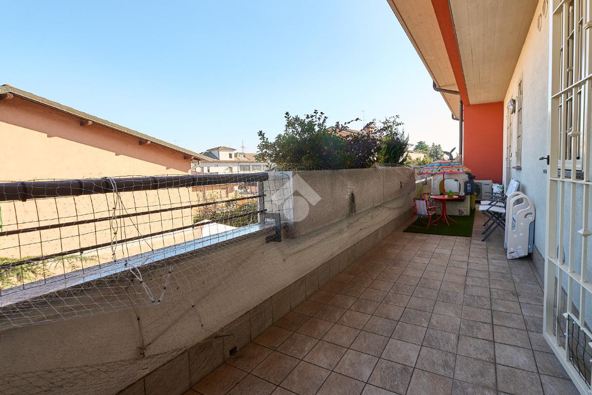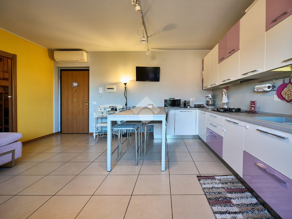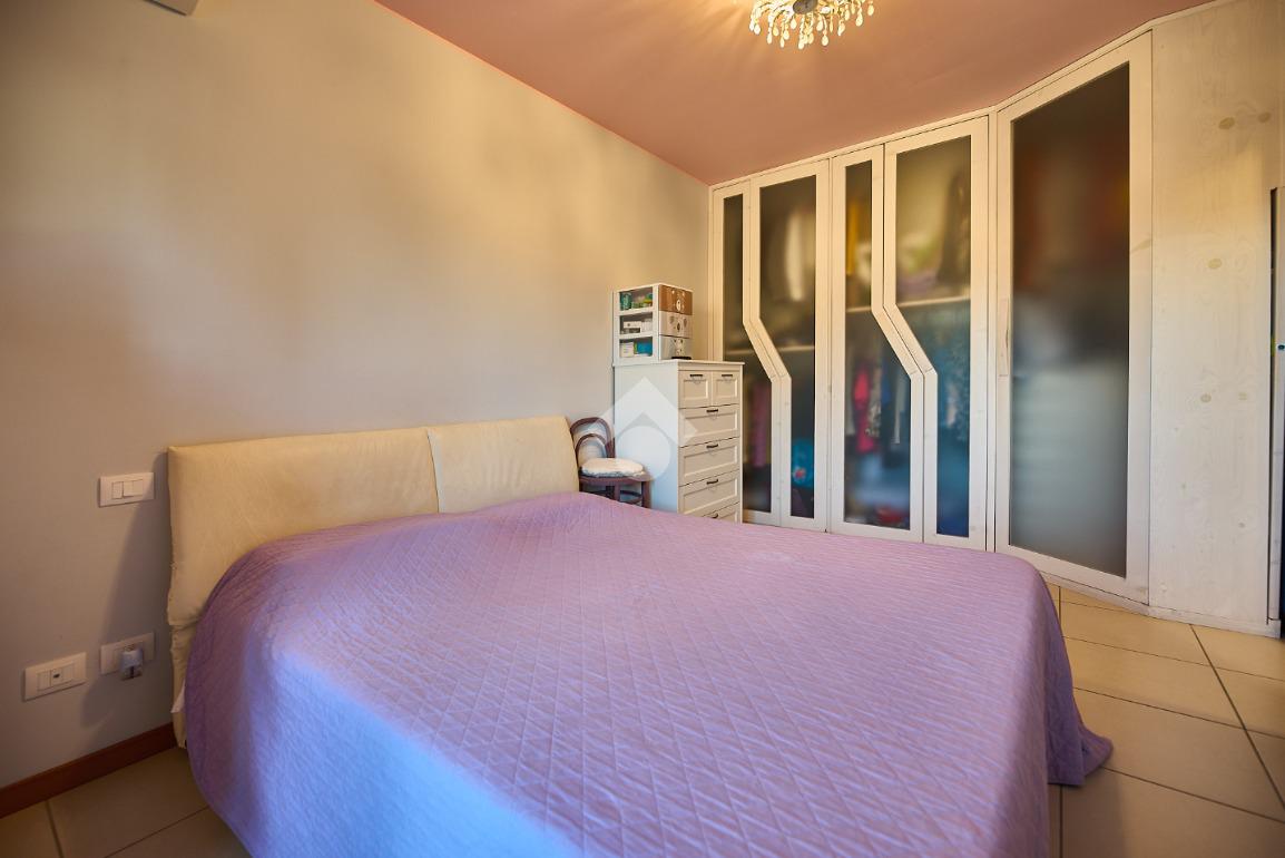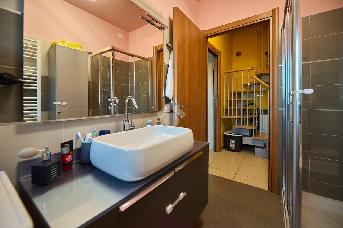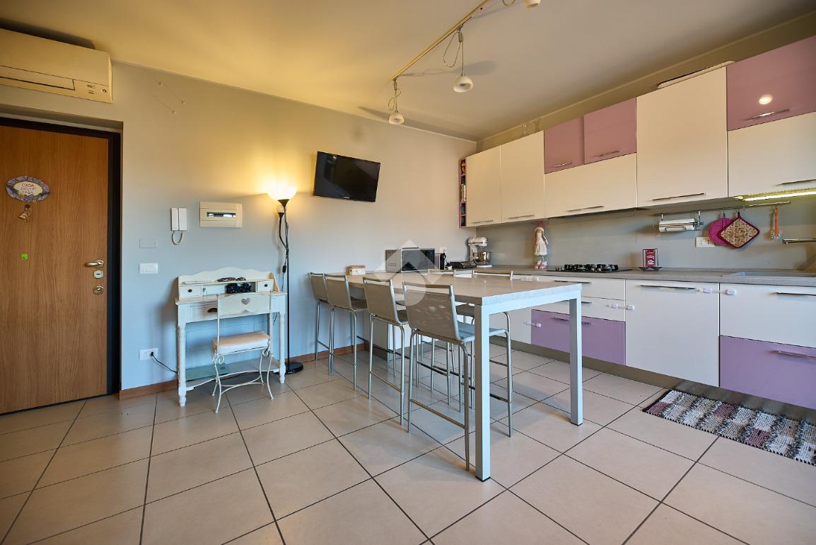 In Via Dante, a pochi poassi dal supermercato e dalla fermata dell'autobus, il polo scolastico e la piazza centrale sono raggiungibili a piedi. L'appartamento è distribuito su due livelli e si trova al primo piano di una palazzina costruita nel 2013 e dotata di ascensore, realizzata nel rispetto delle normative sul risparmio energetico, quindi attrezzata di cappotto termico, ventilazione meccanica, impianto solare termico e riscaldamento a pavimento. L'ingresso è nella zona living con cucina a vista e portafinestra che dà accesso al terrazzo di 20 mq. Dalla zona living si accede al disimpegno che accompagna al bagno, alla camera e alla scala che porta al piano superiore. Il bagno ha la doccia e la finestra, la camera da letto è matrimoniale e grande abbastanza da ospitare anche un lettino qualora ce ne fosse bisogno. Al piano superiore è presente una cameretta con un piccolo balcone e una lavanderia con la doccia. Questa soluzione è l'ideale per chi necessita di uno spazio per lo smart working o per chi ha bisogno di una seconda camera per gli ospiti o i figli grandi. L'appartamento è in ottimo stato, ben tenuto e all'interno di un complesso signorile. Completano la proprietà la cantina ed il box auto.