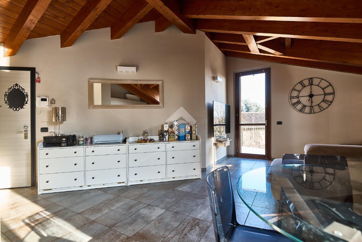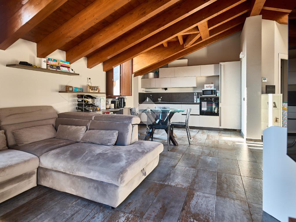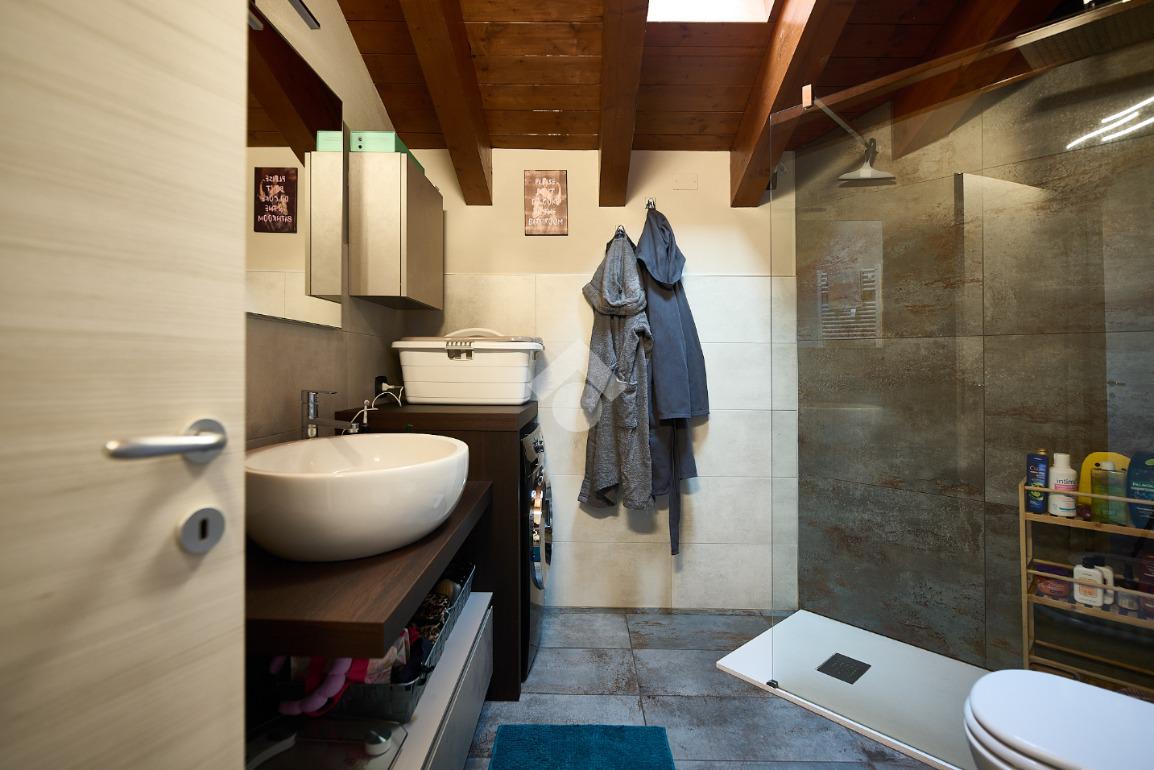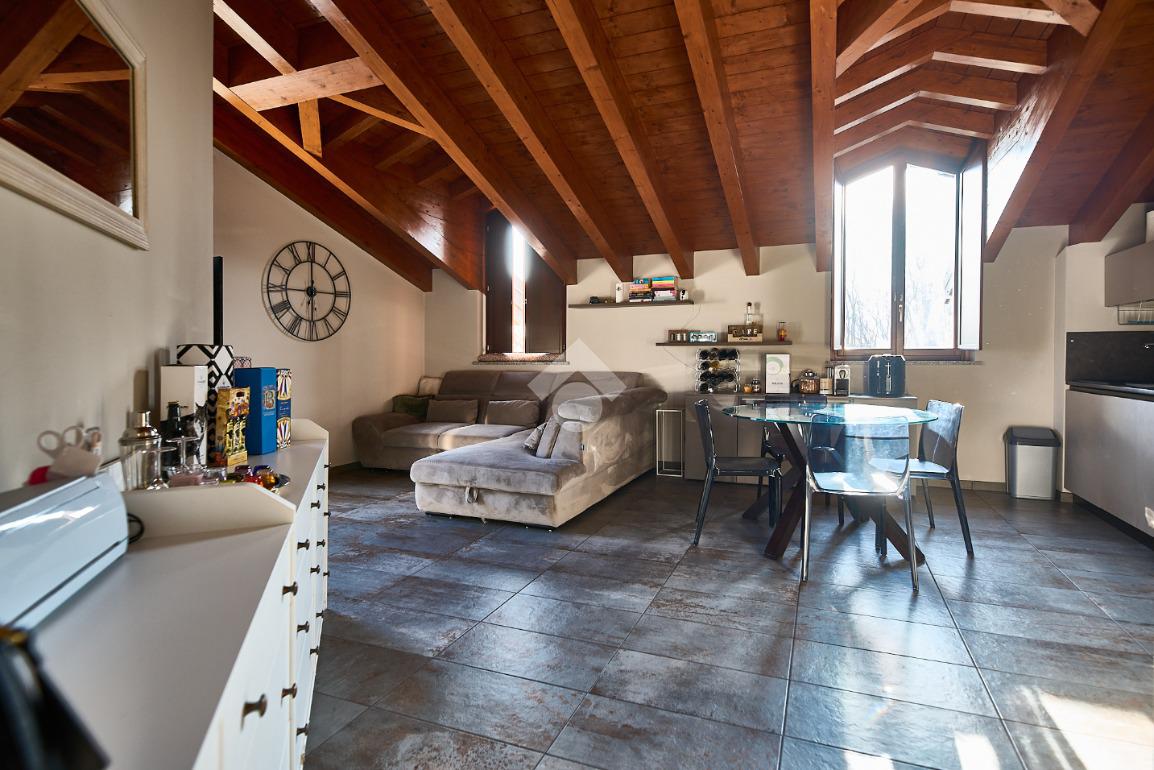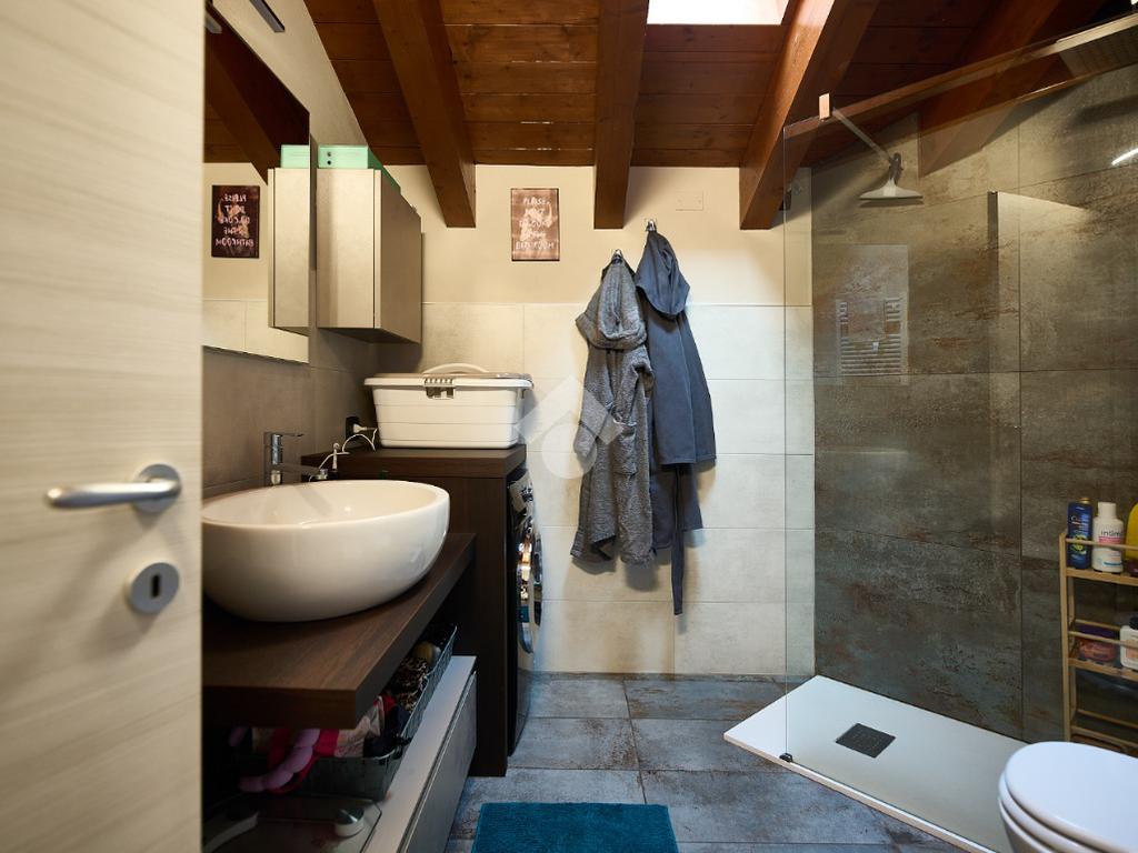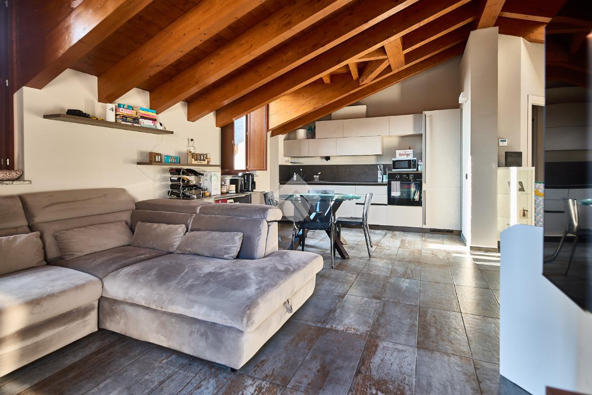 In centro paese, tutti i servizi sono comodamente raggiungibili a piedi, appena sotto casa sono presenti bar e altre attività commerciali, fermata dell'autobus, un parchetto e il supermercato poco più avanti. La palazzina è stata costruita nel 2010 e l'appartamento si trova al secondo ed ultimo piano, quindi ha il soffitto in legno con travi a vista e un terrazzino di 15 mq con affaccio su un'area verde, quindi molto tranquillo. L'ingresso è nella zona living, ampia e molto luminosa, con spazi ben distribuiti tra la zona da pranzo con cucina a vista e la zona relax con divano e tv. Dalla zona giorno un disimpegno accompagna alle camere da letto ed al bagno. Le camere sono due, una matrimoniale ed una singola, il bagno ha il lucernario e una doccia con piatto doppio. Trattandosi di un appartamento di costruzione recente è dotato di riscaldamento a pavimento, serramenti con doppi vetri e predisposizione per l'impianto di aria condizionata, caratteristiche che lo classificano come appartamento ad alta efficienza energetica e che quindi può essere acquistato con l'ausilio di 'mutuo green', ovvero a tasso agevolato. Questa soluzione abitativa viene venduta completa di cucina, arredo bagno e mobile della cameretta. Completa la proprietà il box auto doppio di 25 mq.
