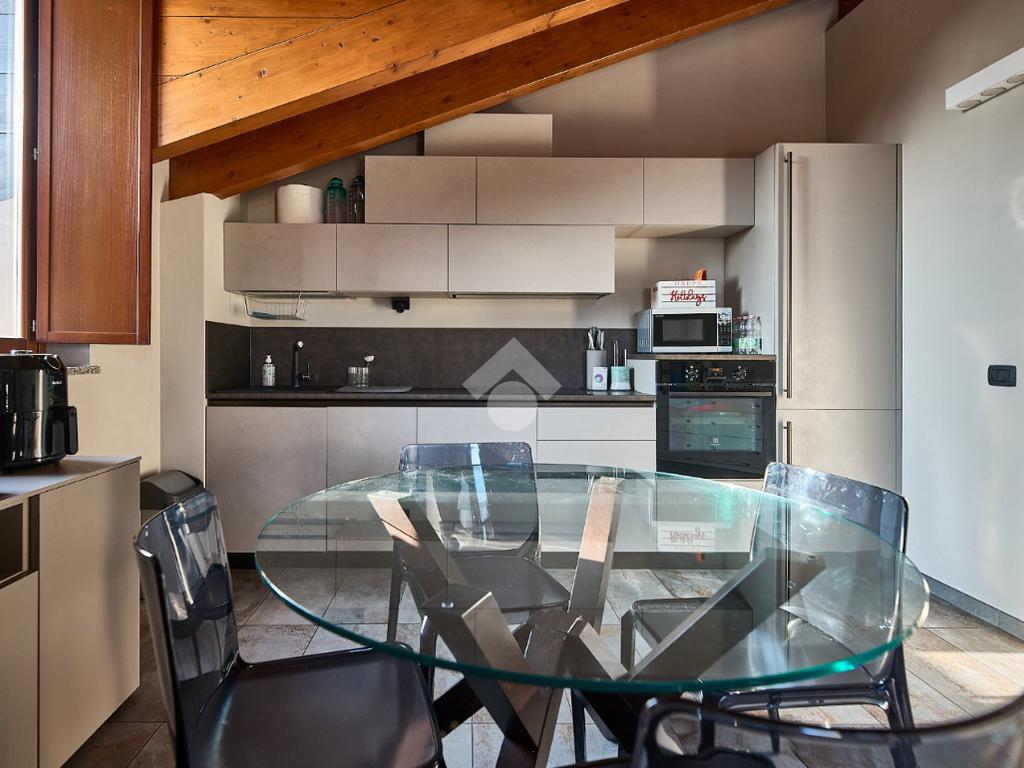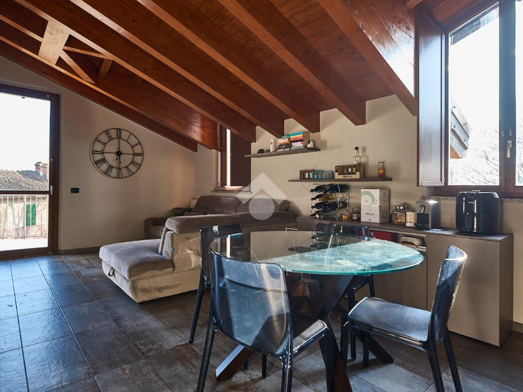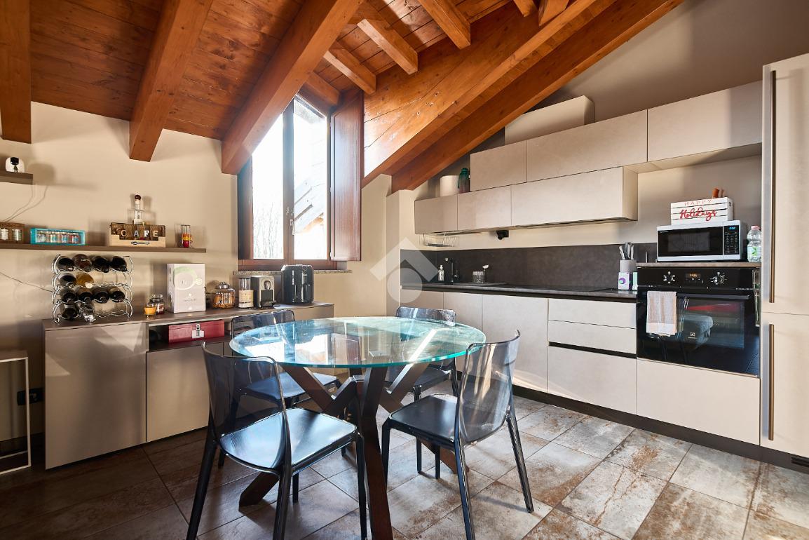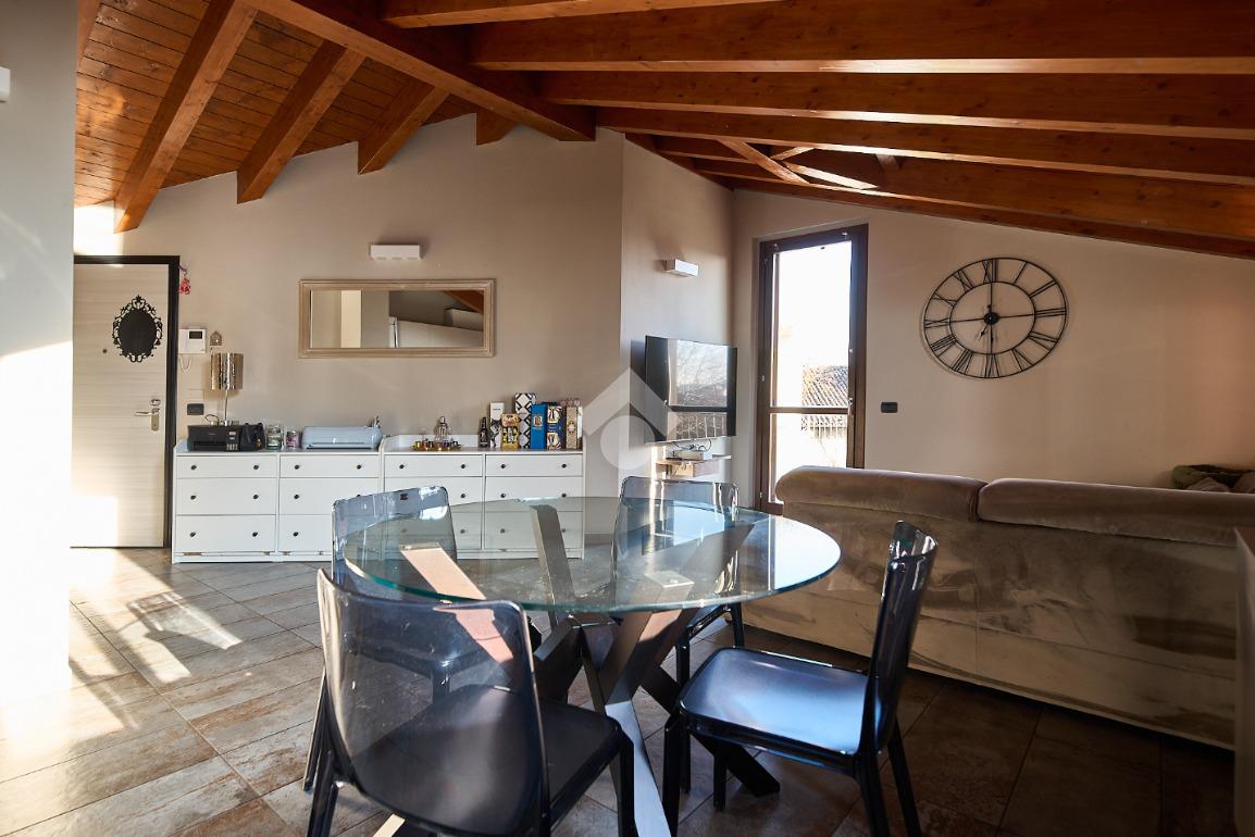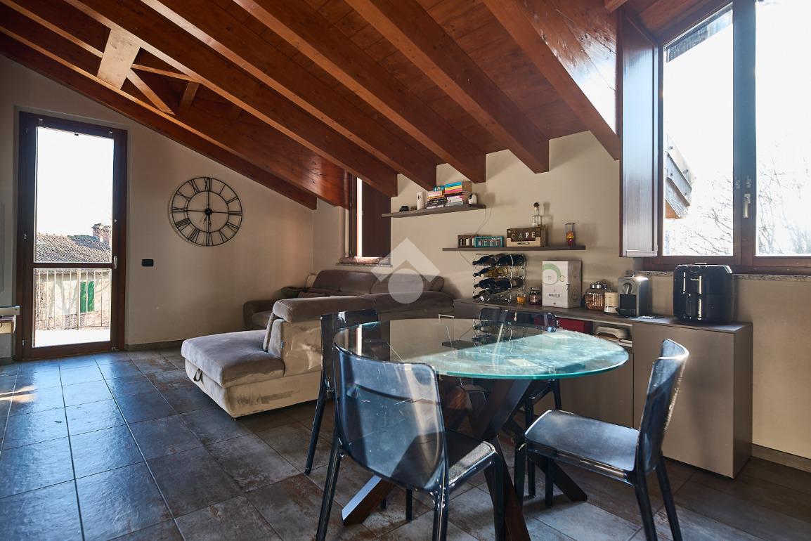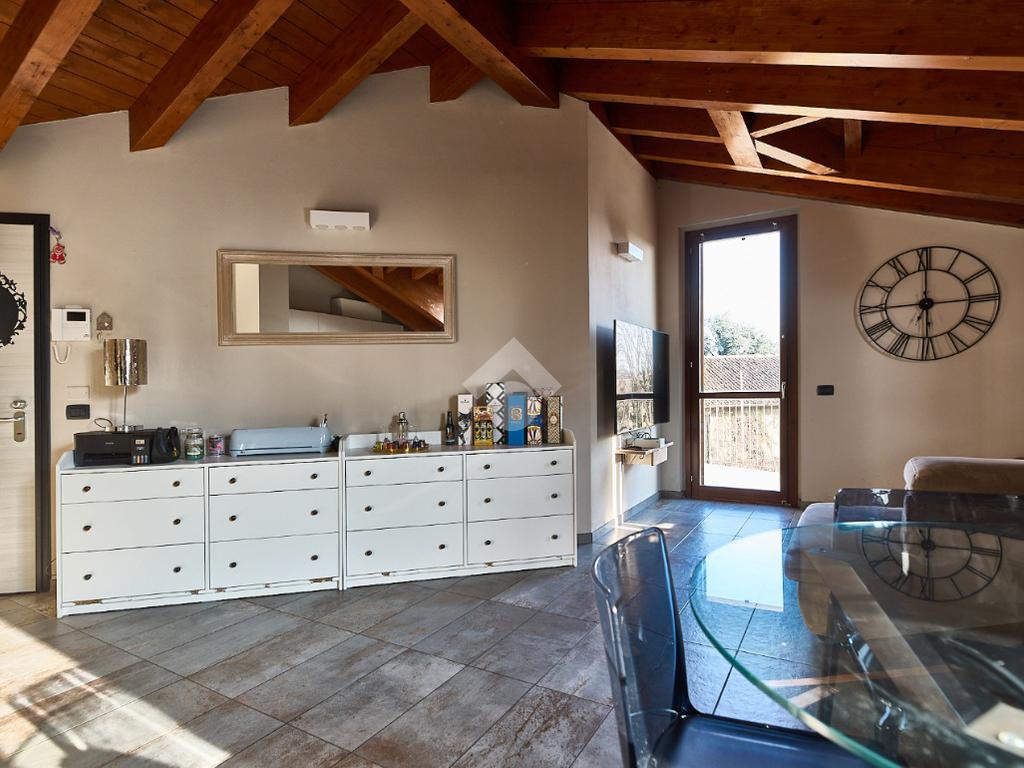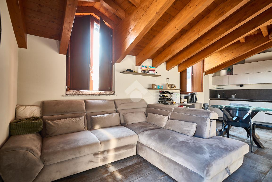 In centro paese, tutti i servizi sono comodamente raggiungibili a piedi, appena sotto casa sono presenti bar e altre attività commerciali, fermata dell'autobus, un parchetto e il supermercato poco più avanti. La palazzina è stata costruita nel 2010 e l'appartamento si trova al secondo ed ultimo piano, quindi ha il soffitto in legno con travi a vista e un terrazzino di 15 mq con affaccio su un'area verde, quindi molto tranquillo. L'ingresso è nella zona living, ampia e molto luminosa, con spazi ben distribuiti tra la zona da pranzo con cucina a vista e la zona relax con divano e tv. Dalla zona giorno un disimpegno accompagna alle camere da letto ed al bagno. Le camere sono due, una matrimoniale ed una singola, il bagno ha il lucernario e una doccia con piatto doppio. Trattandosi di un appartamento di costruzione recente è dotato di riscaldamento a pavimento, serramenti con doppi vetri e predisposizione per l'impianto di aria condizionata, caratteristiche che lo classificano come appartamento ad alta efficienza energetica e che quindi può essere acquistato con l'ausilio di 'mutuo green', ovvero a tasso agevolato. Questa soluzione abitativa viene venduta completa di cucina, arredo bagno e mobile della cameretta. Completa la proprietà il box auto doppio di 25 mq.