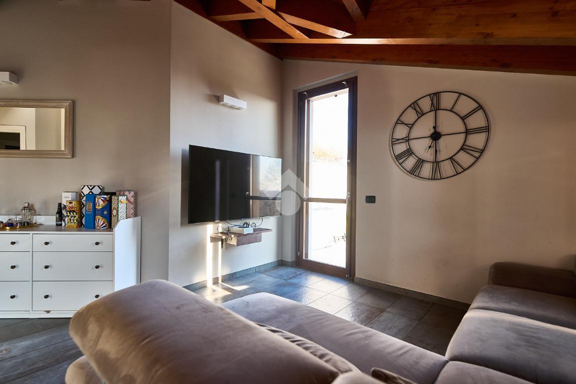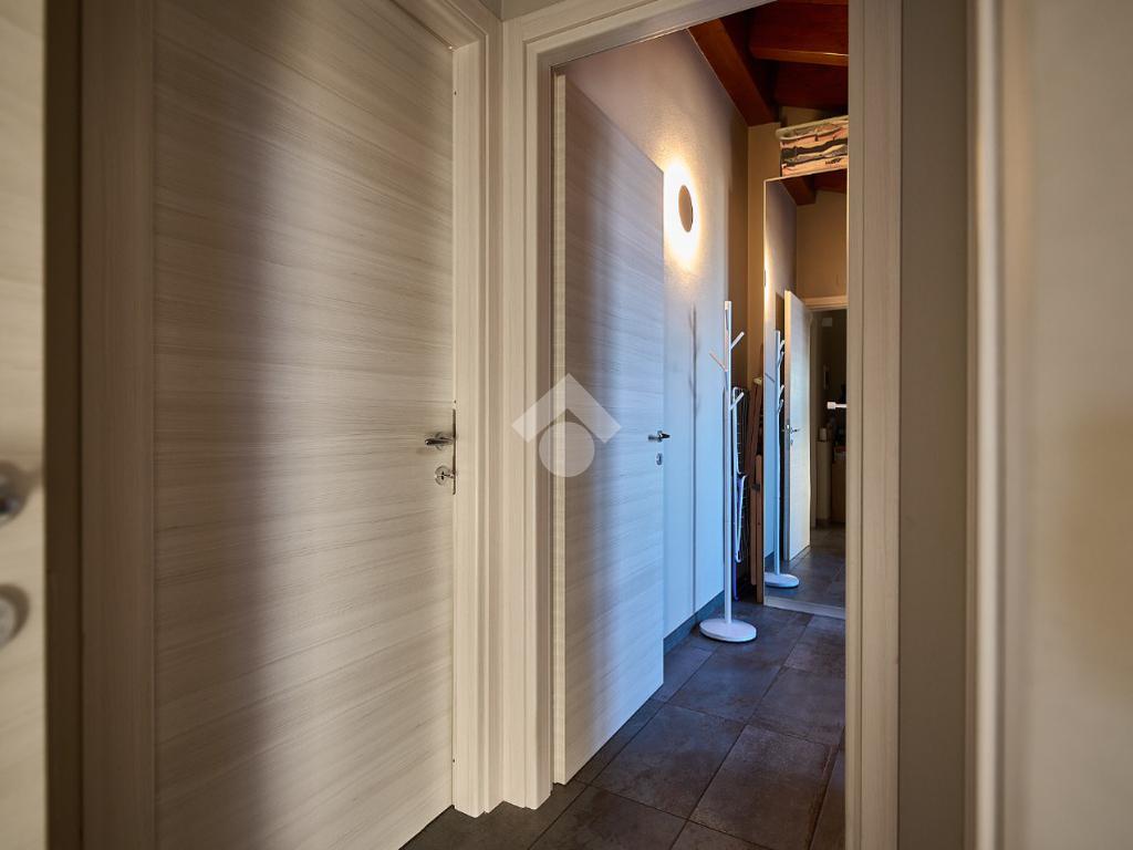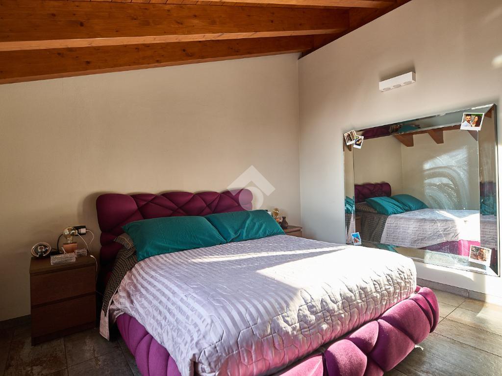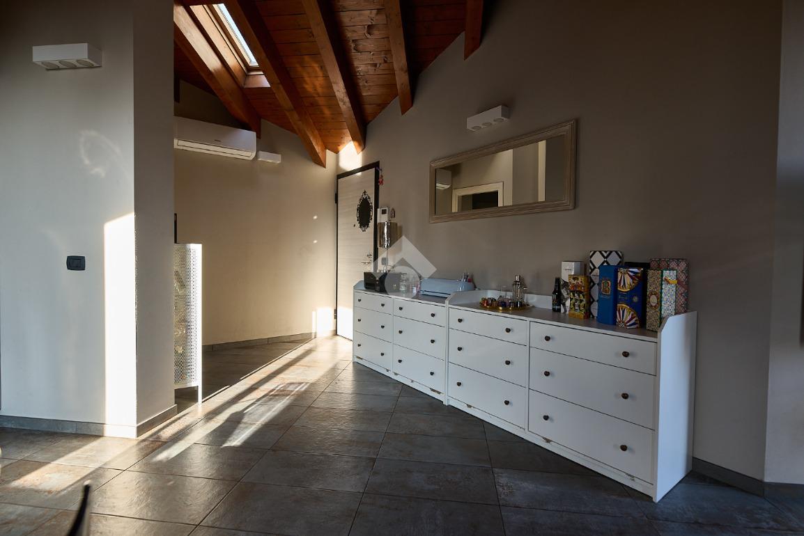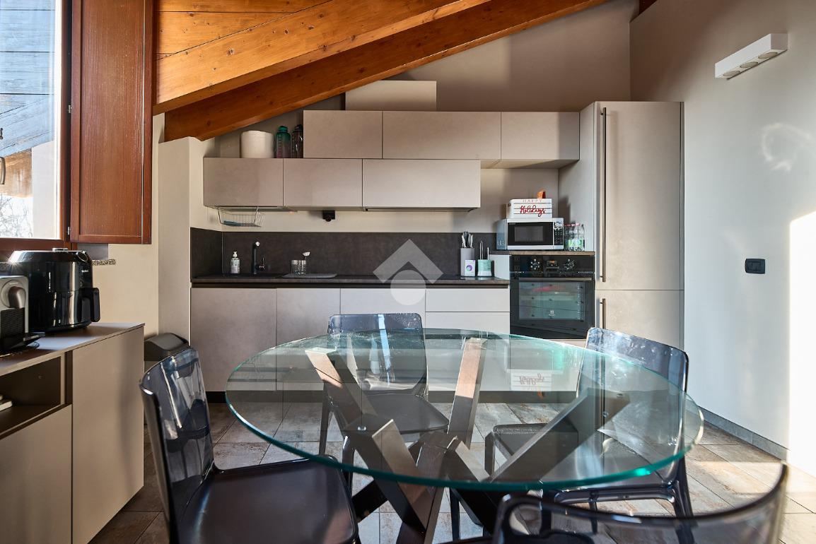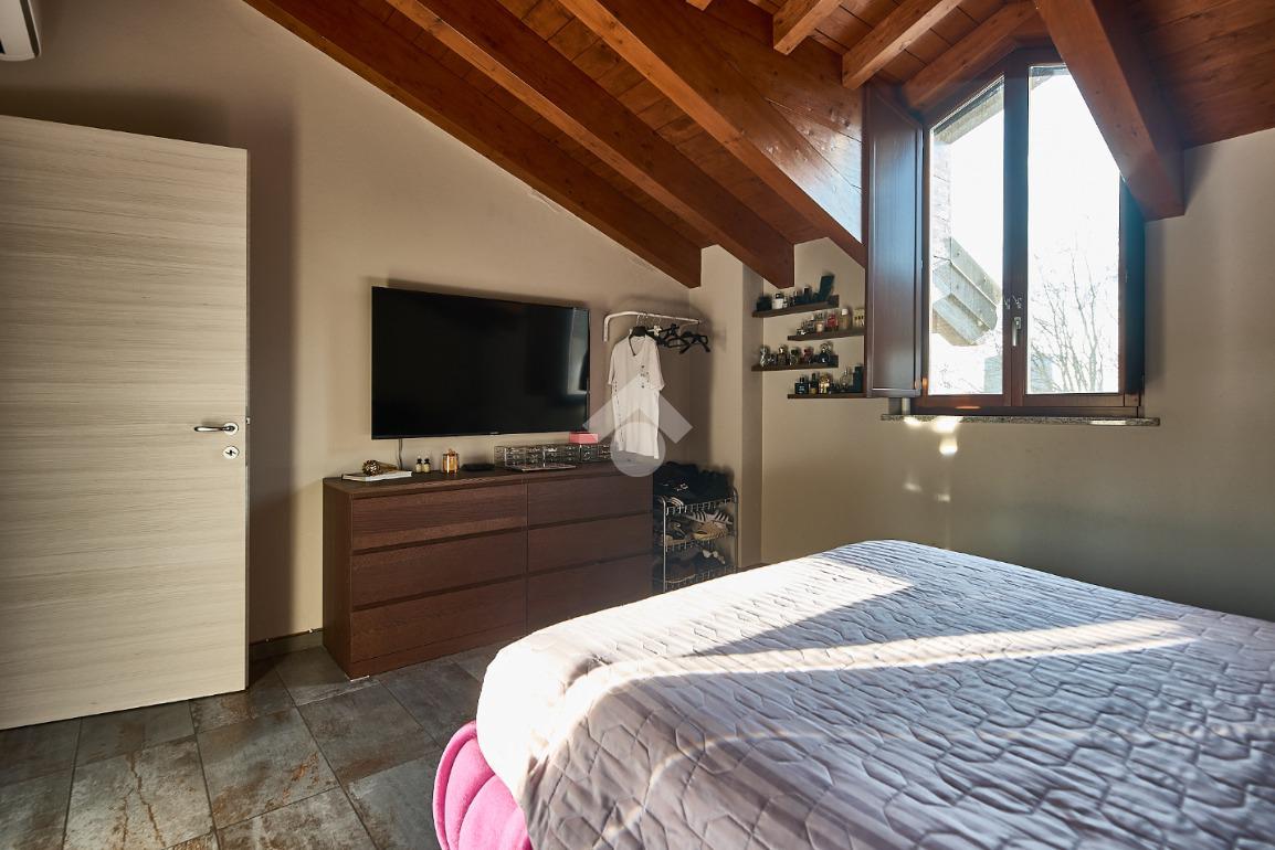 In centro paese, tutti i servizi sono comodamente raggiungibili a piedi, appena sotto casa sono presenti bar e altre attività commerciali, fermata dell'autobus, un parchetto e il supermercato poco più avanti. La palazzina è stata costruita nel 2010 e l'appartamento si trova al secondo ed ultimo piano, quindi ha il soffitto in legno con travi a vista e un terrazzino di 15 mq con affaccio su un'area verde, quindi molto tranquillo. L'ingresso è nella zona living, ampia e molto luminosa, con spazi ben distribuiti tra la zona da pranzo con cucina a vista e la zona relax con divano e tv. Dalla zona giorno un disimpegno accompagna alle camere da letto ed al bagno. Le camere sono due, una matrimoniale ed una singola, il bagno ha il lucernario e una doccia con piatto doppio. Trattandosi di un appartamento di costruzione recente è dotato di riscaldamento a pavimento, serramenti con doppi vetri e predisposizione per l'impianto di aria condizionata, caratteristiche che lo classificano come appartamento ad alta efficienza energetica e che quindi può essere acquistato con l'ausilio di 'mutuo green', ovvero a tasso agevolato. Questa soluzione abitativa viene venduta completa di cucina, arredo bagno e mobile della cameretta. Completa la proprietà il box auto doppio di 25 mq.